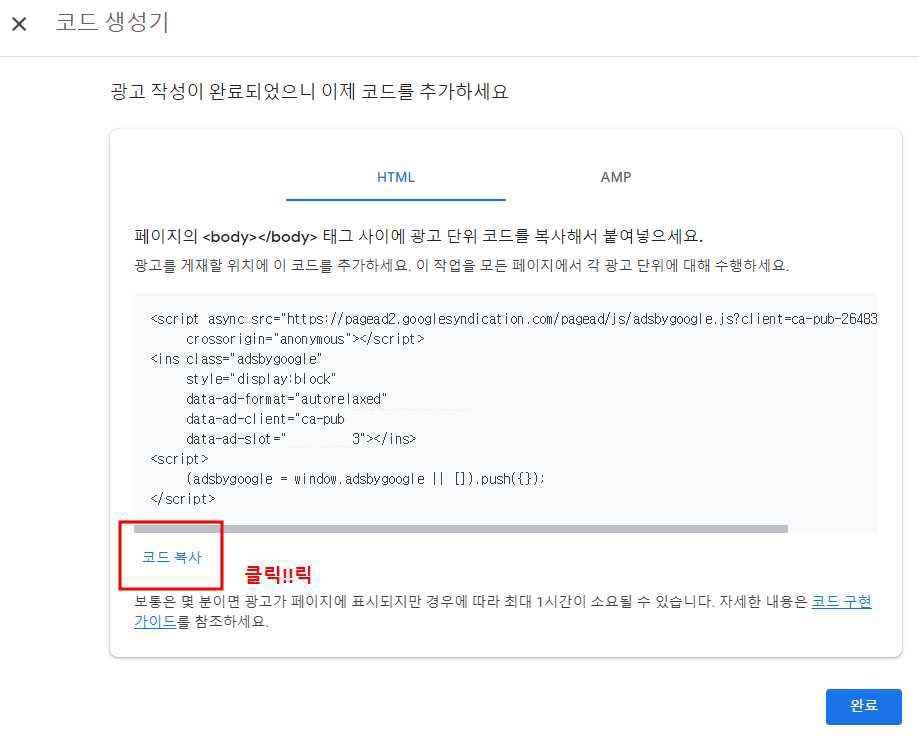 수평형 멀티플렉스 광고를 만들기 하시면 코드 생성기가 나옵니다.