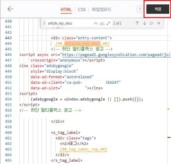 전 443번줄이 본문이 나오기 때문에 445번부터 456에 애드센스 멀티플렉스 광고 코드를 넣어주었습니다.