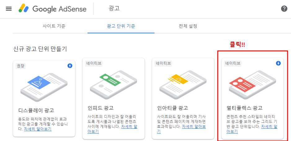 위와 같이 멀티 플렉스 광고를 클릭합니다.