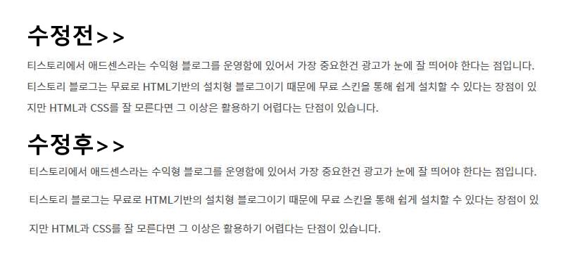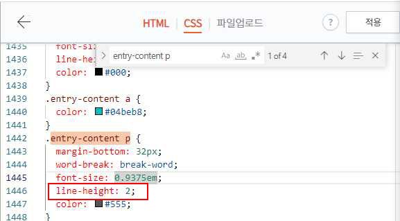 여기서 고쳐야할 코드는 'line-height: 2;'를 수정해야 하는데 너무 줄간격이 멀면 가독성이 떨어지기 때문에 조금씩 올려주면서 이정도면 되겠다고 싶을때 그 값을 적용해주시면 됩니다.