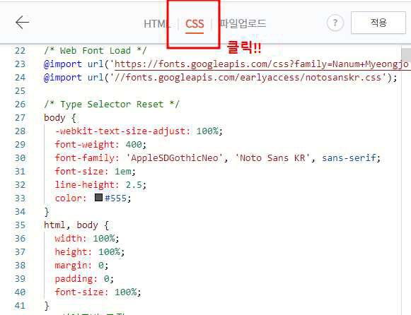 스킨 편집 화면에서 HTML편집 > CSS을 클릭합니다.
